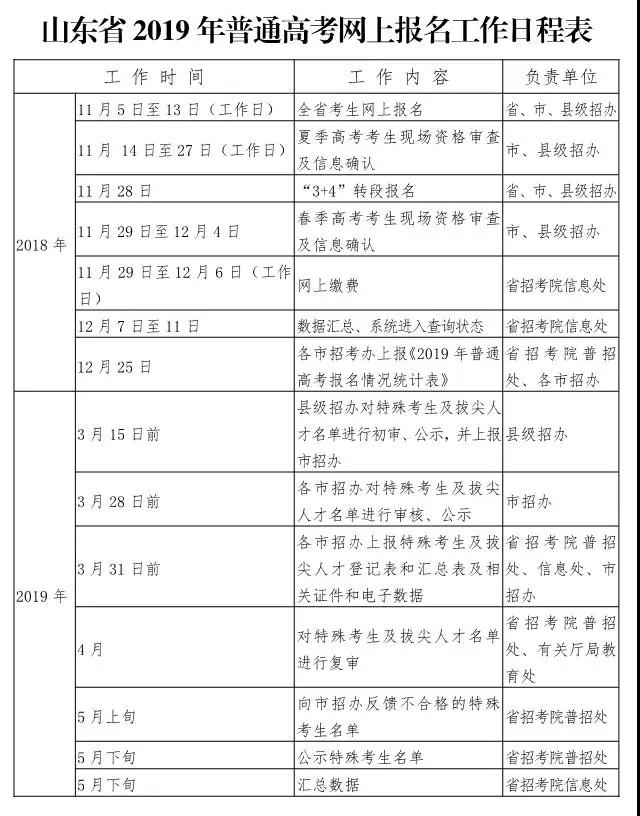 春季高考和夏季高考考生网上填报信息时间均为2018年11月5日至13日(工作日,每天9:00-17:00)。只报考“3+4”转段的考生及兼报“3+4”转段和春季高考的考生网上填报信息时间为2018年11月28日。