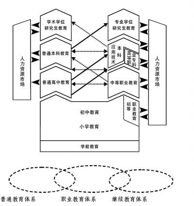 教育体系基本框架示意图。按照终身教育的理念,形成服务需求、开放融合、纵向流动、双向沟通的现代职业教育的体系框架和总体布局。